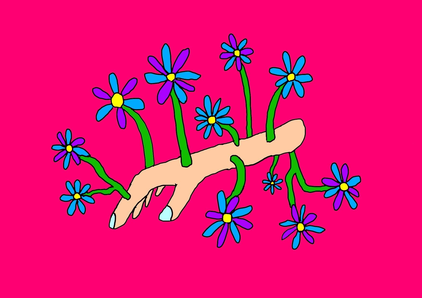 右手から花が咲く奇妙さを表現しました。